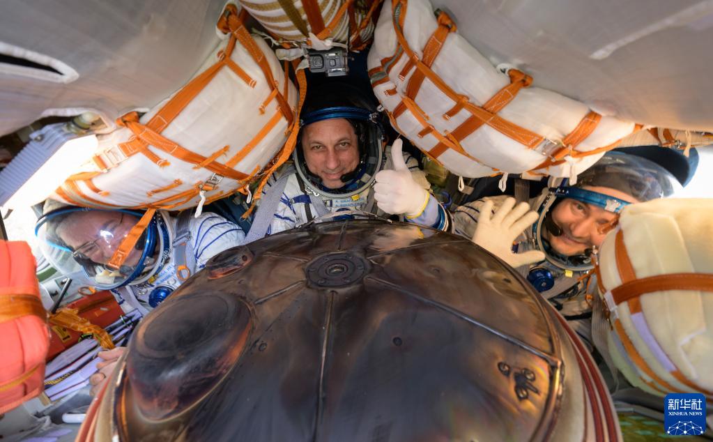 3月30日,美国宇航员马克·范德·海(左)与俄罗斯宇航员彼得·杜布罗夫(右)和安东·什卡普列罗夫在“联盟”飞船上。