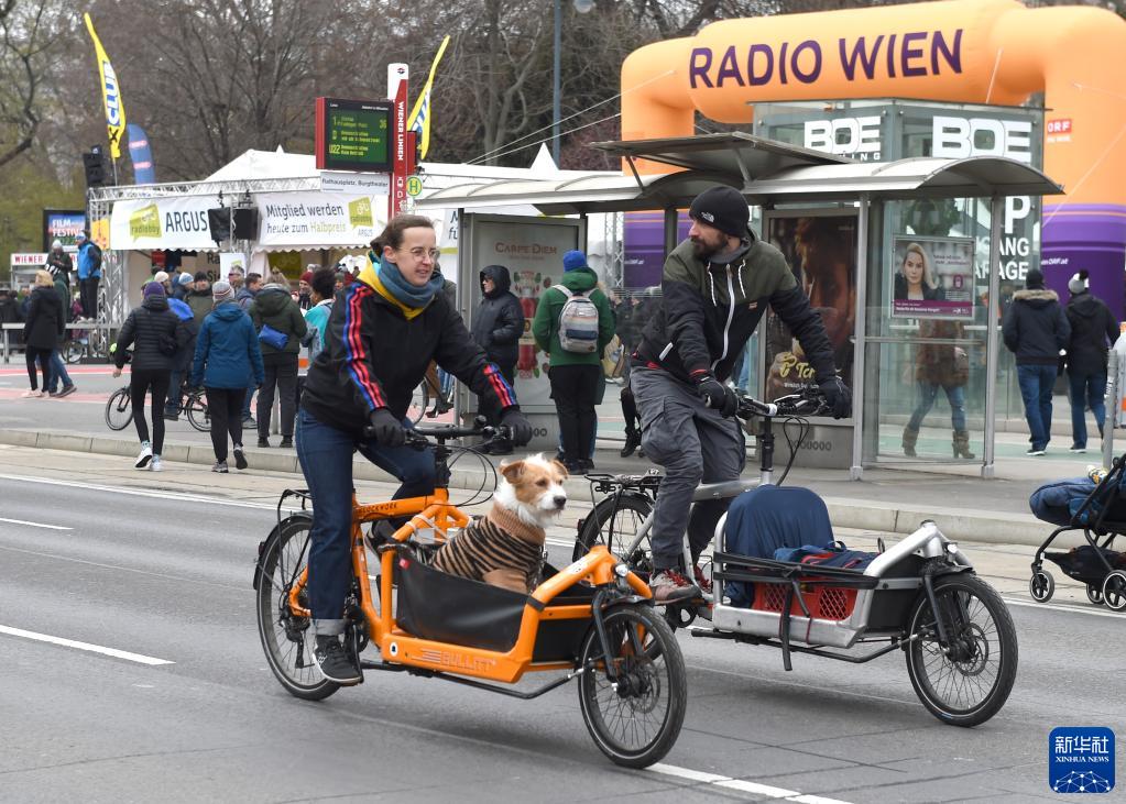 4月3日,市民在奥地利维也纳参加2022奥地利阿格斯自行车节环城骑行活动。