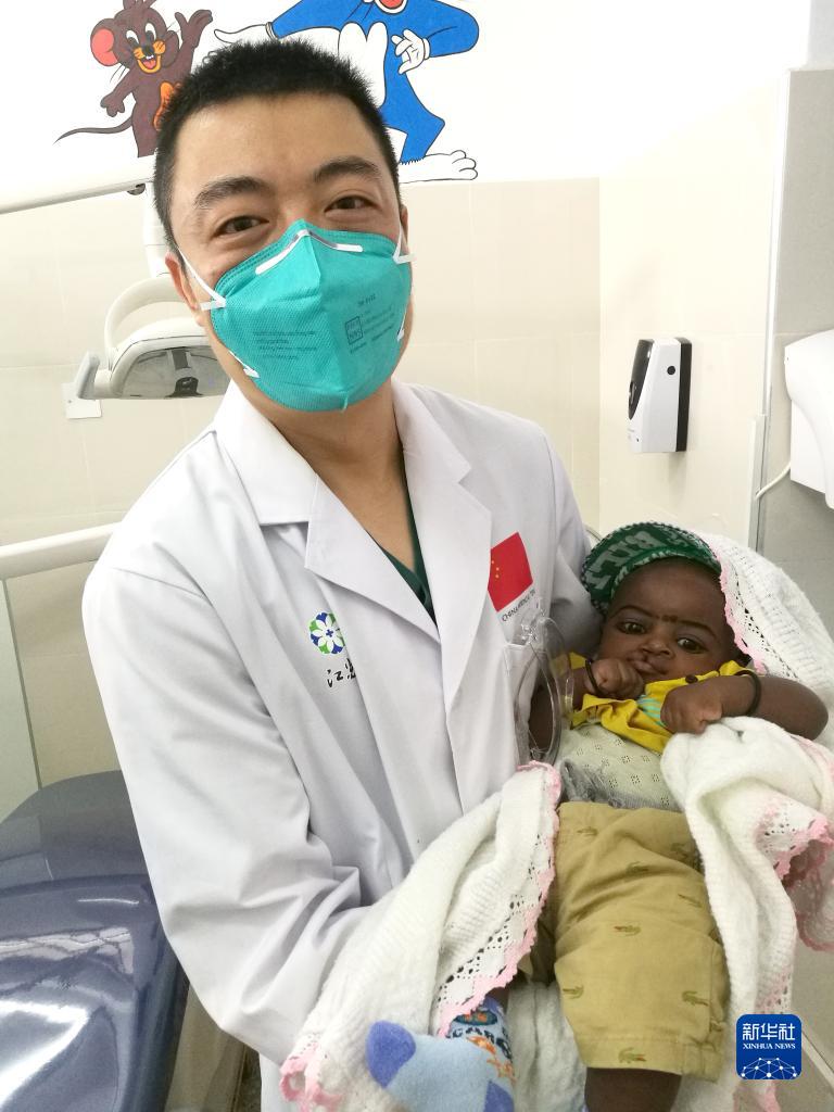 3月31日,在坦桑尼亚桑给巴尔,医疗队口腔外科医生徐克抱着刚接受手术治疗的先天性唇腭裂患儿。新华社发(中国医疗队供图)