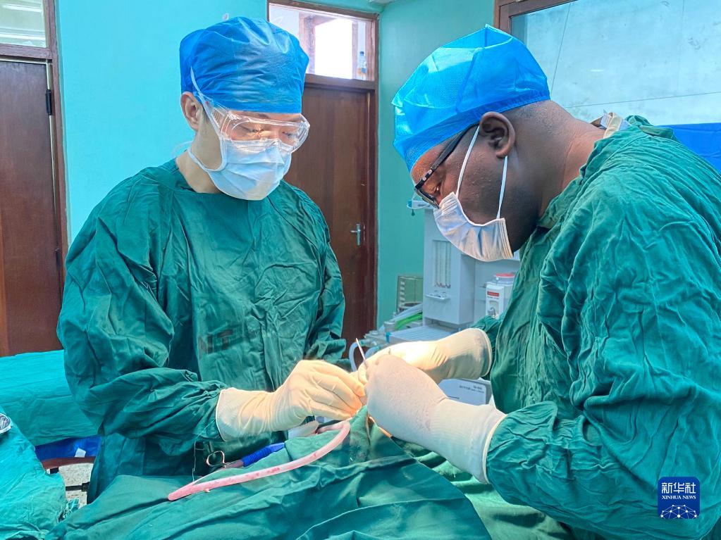 3月31日,在坦桑尼亚桑给巴尔,医疗队口腔外科医生徐克(左)和当地助手为先天性唇腭裂患儿实施手术。新华社发(中国医疗队供图)