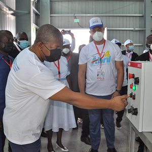 4月4日,安哥拉总统洛伦索在库内内省按下抗旱项目一期工程泵机启动键。新华社发(许昆鹏摄)