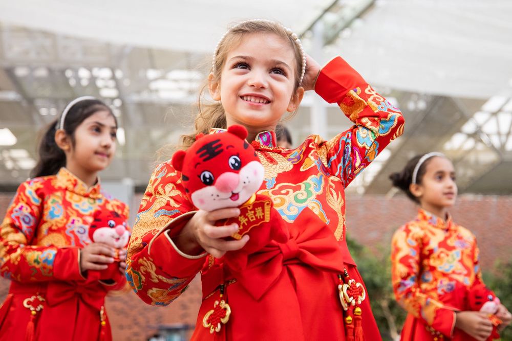 ↑1月31日,当地小朋友们在迪拜世博园内给游客拜年。