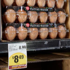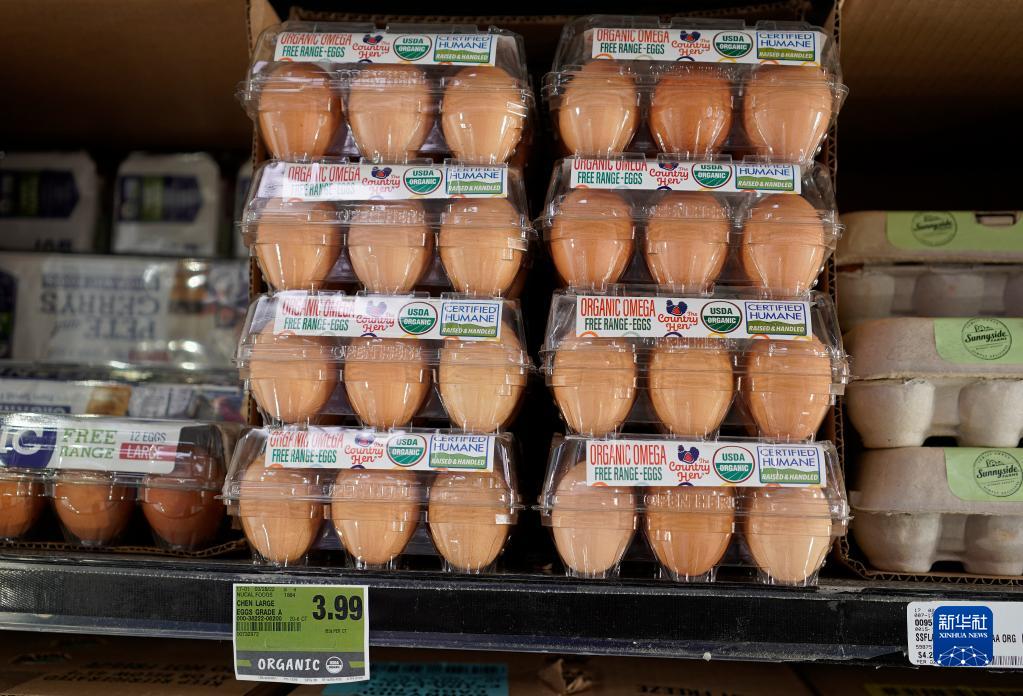 这是4月5日在美国旧金山湾区米尔布雷一家超市拍摄的鸡蛋。