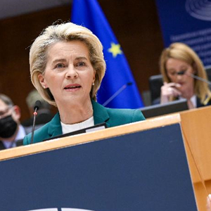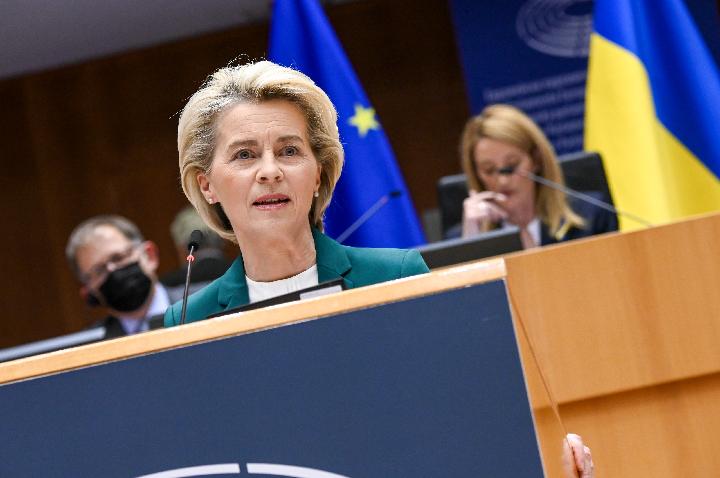3月1日,欧盟委员会主席冯德莱恩在比利时布鲁塞尔举行的欧洲议会全会上讲话。新华社发(欧盟供图)