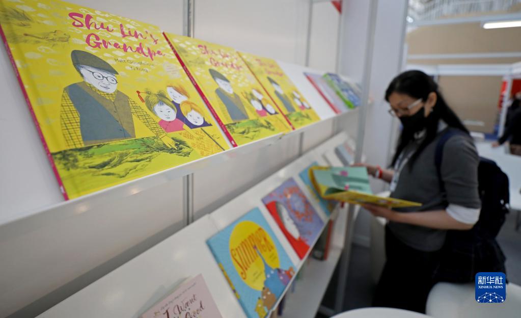 这是4月5日在英国伦敦书展上拍摄的郁蓉新作、儿童绘本《舒琳的外公》。