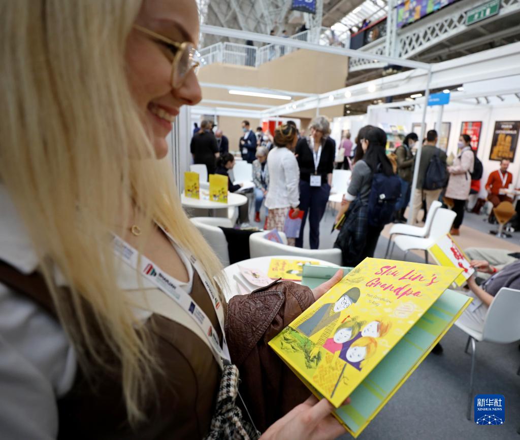 4月5日,一名读者在英国伦敦书展上阅读郁蓉新作、儿童绘本《舒琳的外公》。