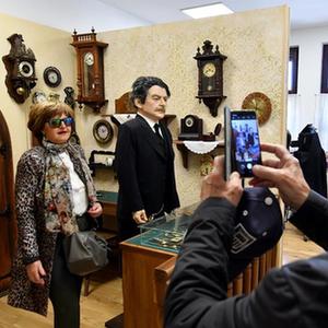 4月6日,在波黑比斯特里察火车站,一名男子参观二楼的《瓦尔特保卫萨拉热窝》纪念展览馆。