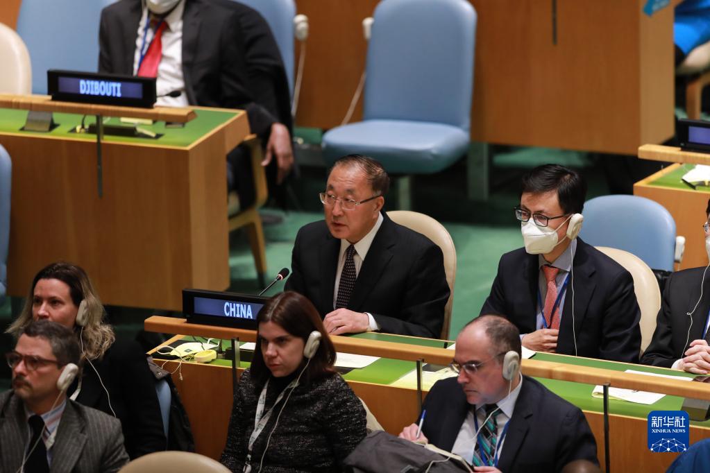 4月7日,在位于纽约的联合国总部,中国常驻联合国代表张军(中排左一)在联合国大会乌克兰问题紧急特别会议表决前做解释性发言。新华社记者 谢锷 摄
