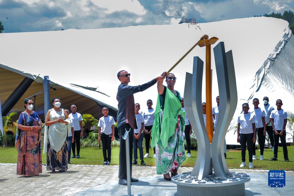 4月7日,卢旺达总统卡加梅(前左)与夫人珍妮特在基加利出席大屠杀28周年纪念活动时点燃纪念火炬。新华社发(西里尔·恩德格亚摄)