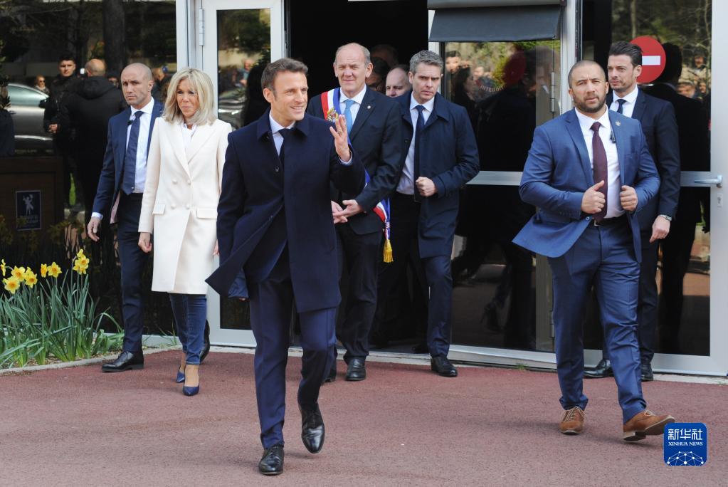 4月10日,在法国北部的勒图凯-巴黎普拉日,法国总统马克龙(前中)和夫人布里吉特(左二)在投票后走出投票站。