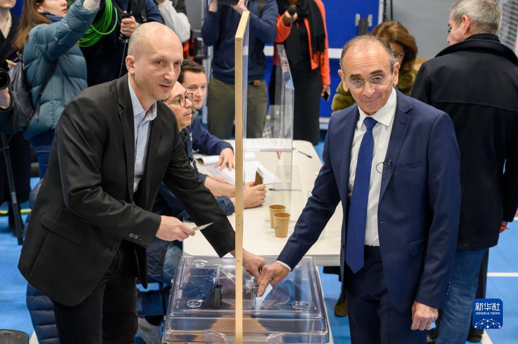 4月10日,法国极右翼政党光复党候选人埃里克·泽穆尔(前右)在巴黎的一处投票站投票。