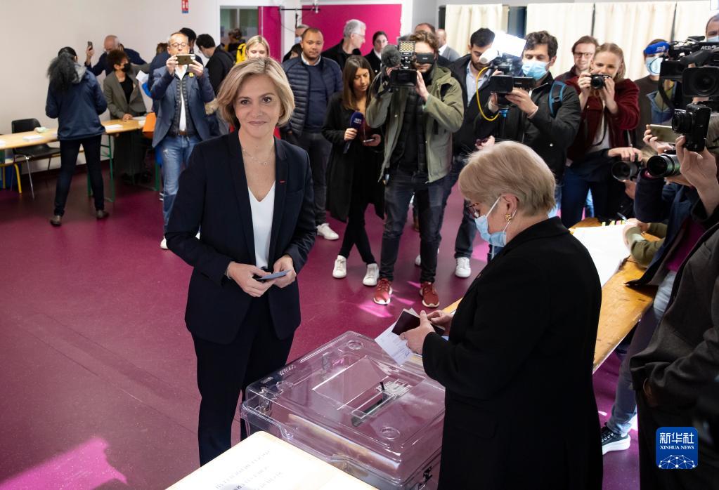 4月10日,法国右翼政党共和党候选人瓦莱丽·佩克雷斯在巴黎近郊的韦利济-维拉库布莱一处投票站投票。