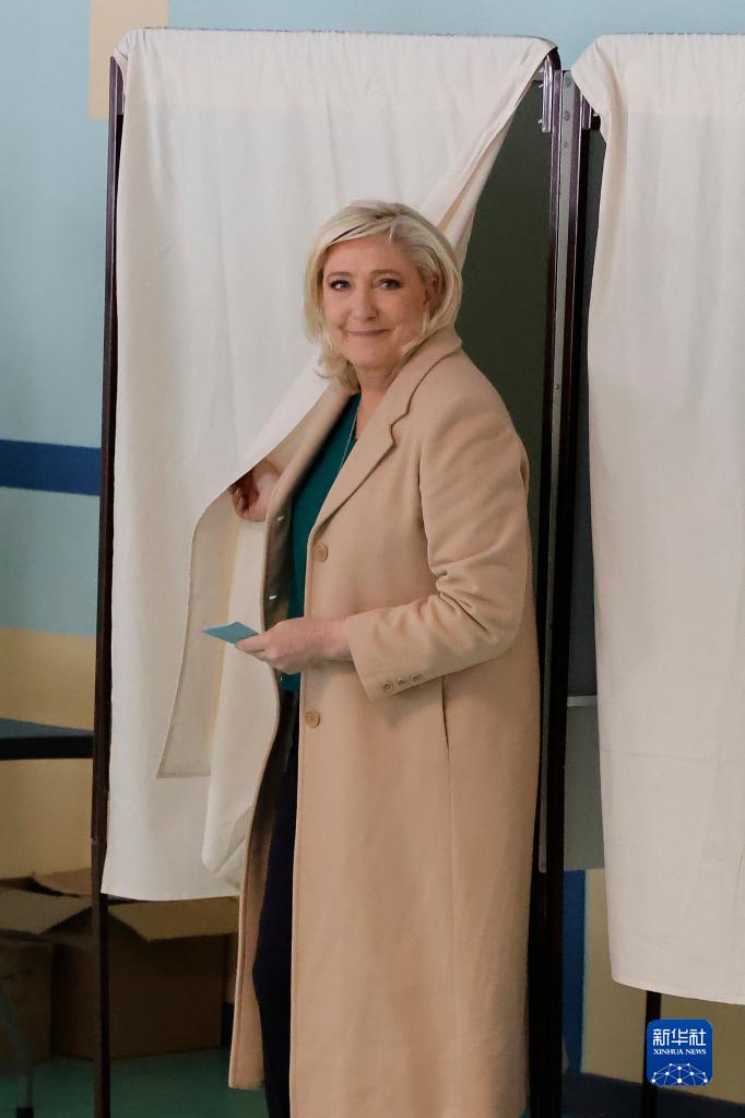 4月10日,法国极右翼政党“国民联盟”候选人玛丽娜·勒庞在埃南-博蒙的一处投票站投票。