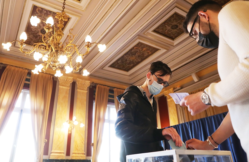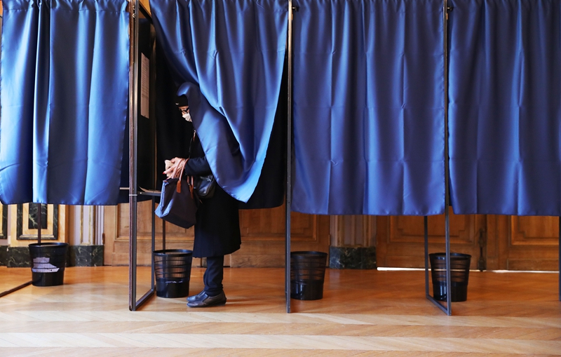 ↑4月10日,选民在法国巴黎郊区的克里希市一家投票站投票。新华社记者 高静 摄