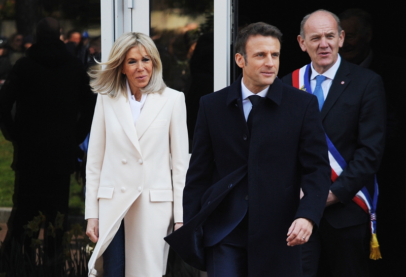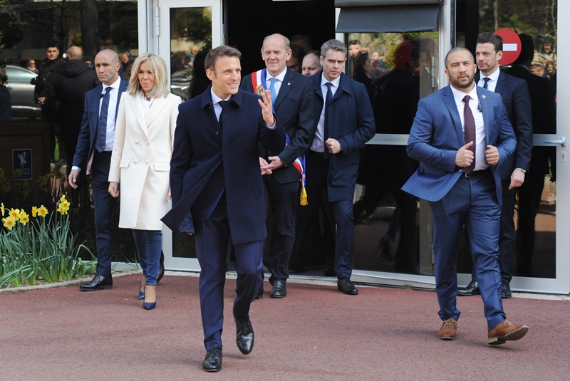 ↑4月10日,在法国北部的勒图凯-巴黎普拉日,法国总统马克龙(中)和夫人布里吉特(左)在投票后走出投票站。新华社发(杰尼·威廉摄)