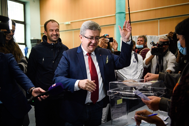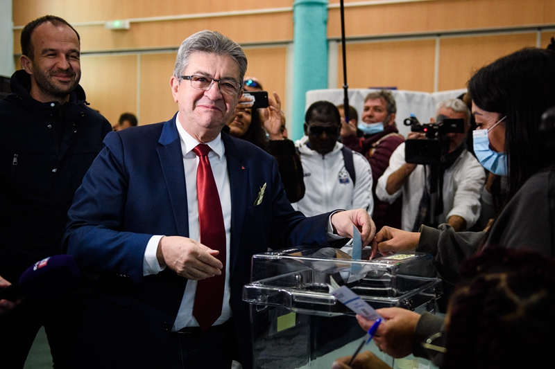 ↑4月10日,法国极左翼政党“不屈法国”党候选人让-吕克·梅朗雄在马赛的一处投票站投票。新华社发(克莱芒·马乌铎摄)