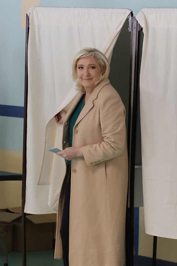 ↑4月10日,法国极右翼政党“国民联盟”候选人玛丽娜·勒庞在埃南-博蒙的一处投票站投票。新华社发(里特·艾斯摄)