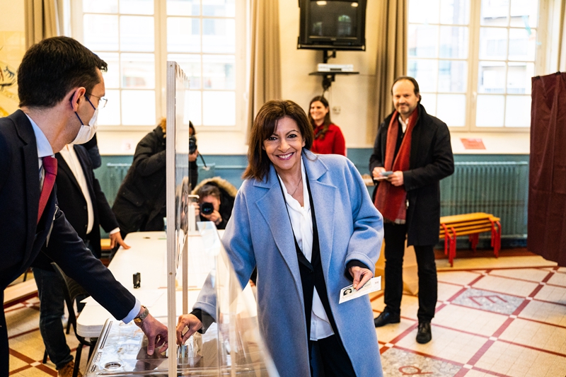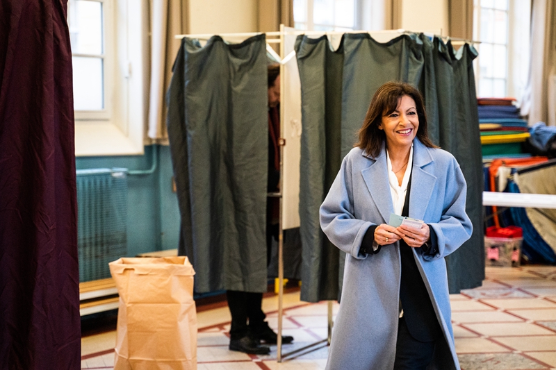 ↑4月10日,法国左翼政党社会党候选人、巴黎市长安妮·伊达尔戈在巴黎的一处投票站投票。新华社发(何塞·博萨斯摄)