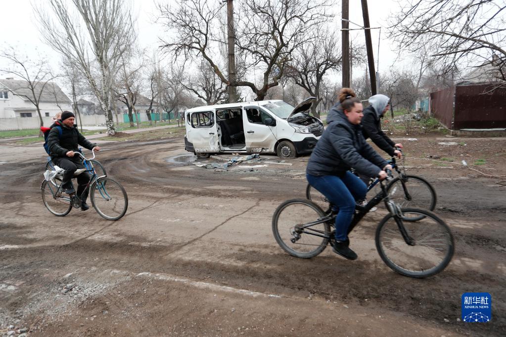 4月12日,马里乌波尔当地居民骑车经过一辆被损坏的汽车。
