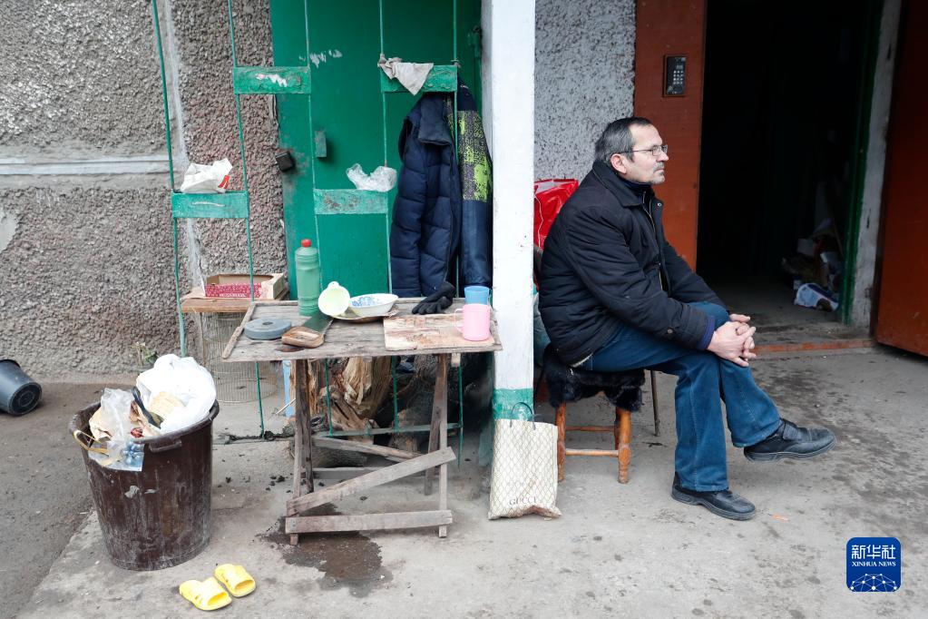 4月12日,一名马里乌波尔当地居民坐在门口休息。