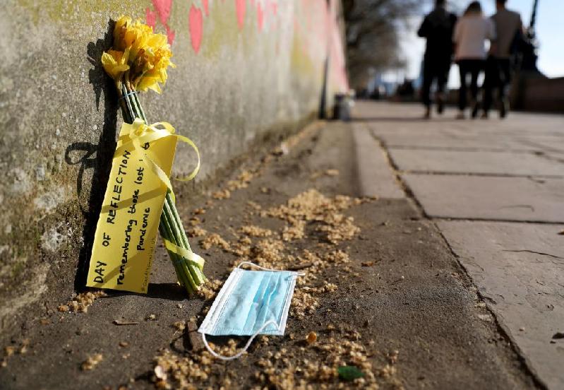 这是3月27日在英国伦敦国家新冠纪念墙边拍摄的花束和口罩。花束旁的字条上写着“纪念在疫情中失去生命的人们”。新华社记者李颖摄