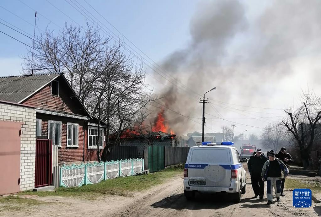 这张4月14日的视频截图显示的是俄罗斯布良斯克地区克利莫沃遭袭后起火的房屋。新华社/塔斯社