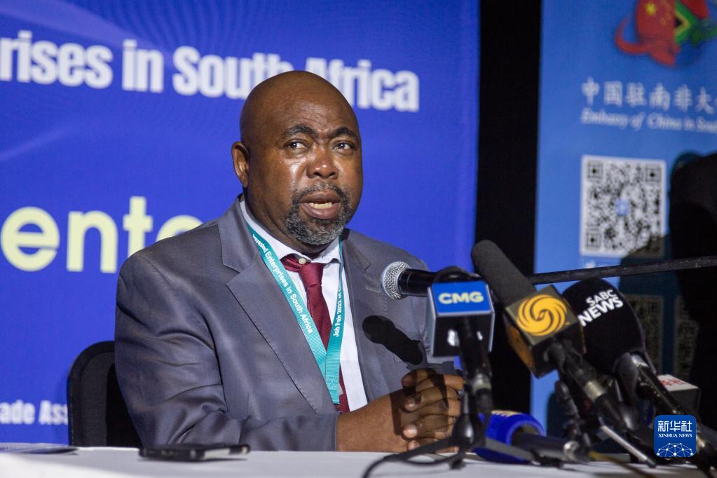 4月14日,南非总统特别代表、就业和劳动部长图拉斯·恩克塞西在约翰内斯堡举办的中资企业招聘会上讲话。新华社发(耶希尔摄)
