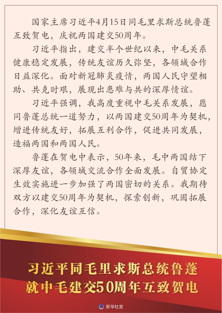 新华社北京4月15日电 国家主席习近平4月15日同毛里求斯总统鲁蓬互致贺电,庆祝两国建交50周年。