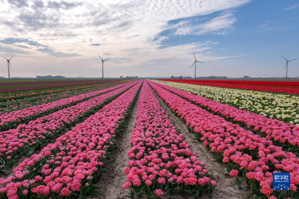 这是4月14日在荷兰弗莱福兰省拍摄的郁金香花田。