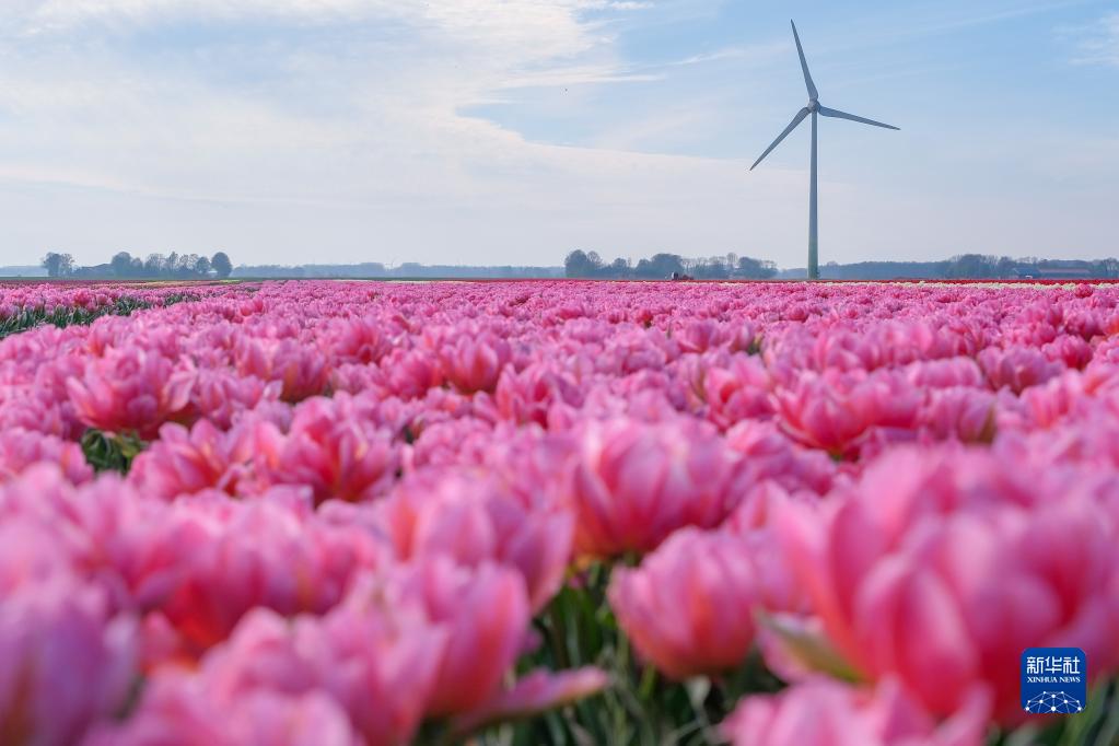 这是4月14日在荷兰弗莱福兰省拍摄的郁金香花田。