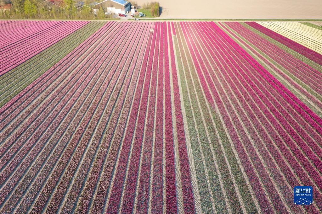 这是4月14日在荷兰弗莱福兰省拍摄的郁金香花田(无人机照片)。
