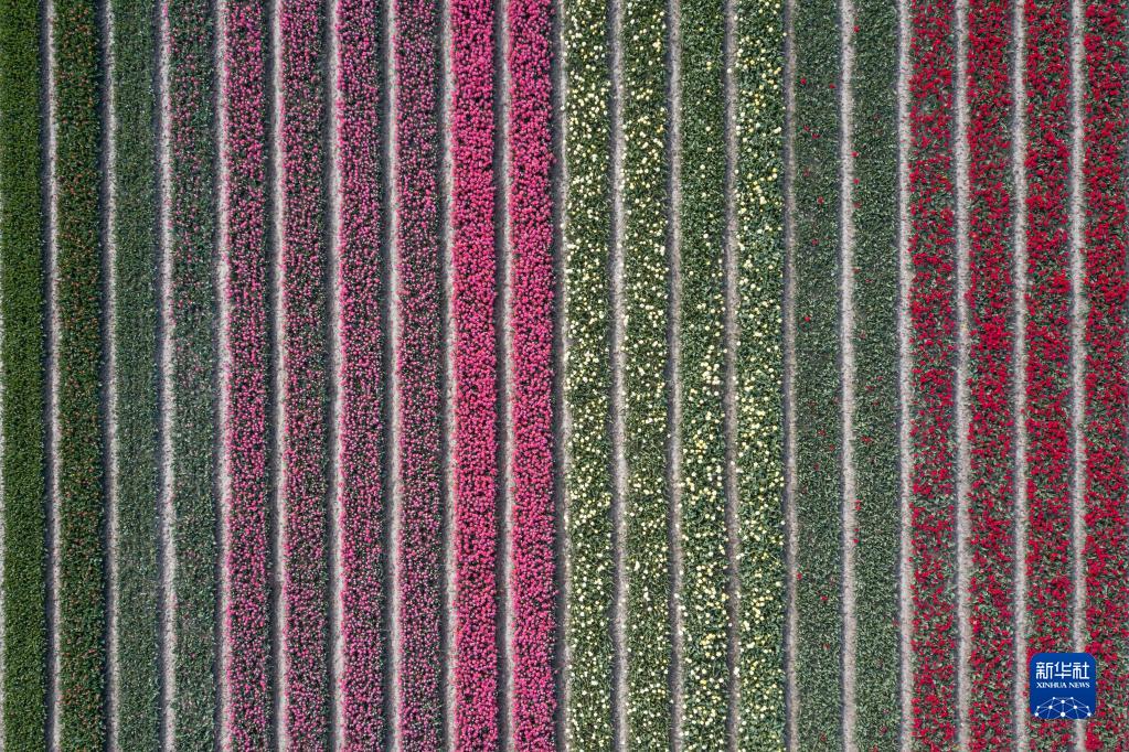 这是4月14日在荷兰弗莱福兰省拍摄的郁金香花田(无人机照片)。