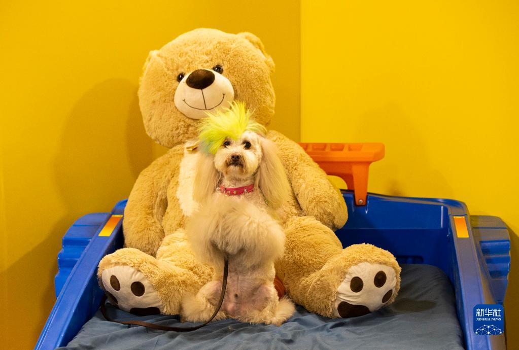 4月15日,在加拿大米西索加举办的加拿大春季宠物博览会上,一只宠物犬在宠物影棚留影。
