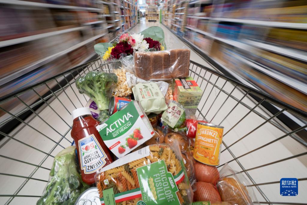 这是4月13日在英国曼彻斯特一家超市内拍摄的购物车。
