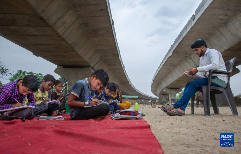 4月12日,在印度新德里,孩子们在一座大桥下临时组成的“教室”中学习。