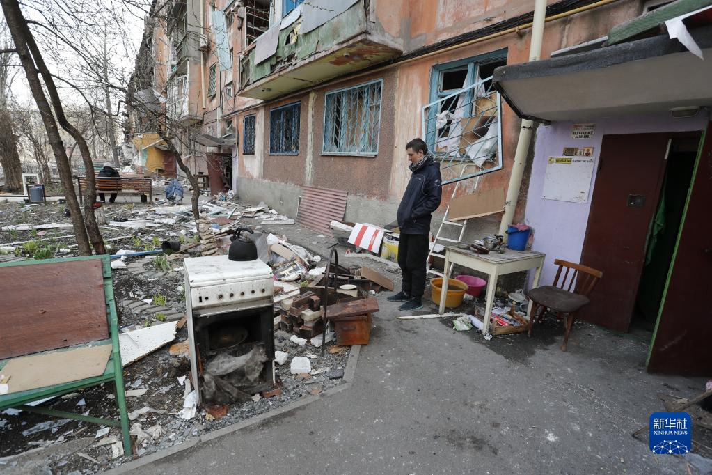 4月17日,在马里乌波尔,当地居民站在被损坏的建筑旁。新华社发(维克托 摄)