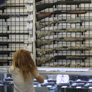 这是2017年10月4日在美国拉斯维加斯的“新前线”枪械商店拍摄的待售枪支。(新华社记者王迎摄)