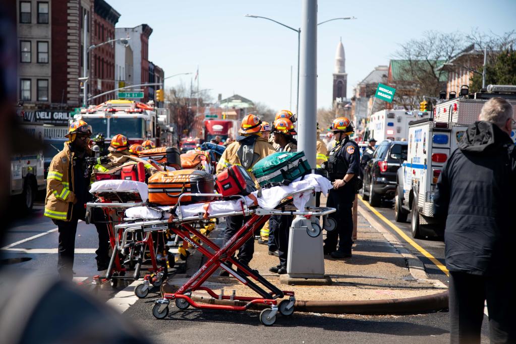 4月12日,救护人员在美国纽约发生枪击的地铁站附近工作。纽约市布鲁克林区地铁站12日早上发生一起枪击事件,造成多人受伤。新华社发(郭克摄)