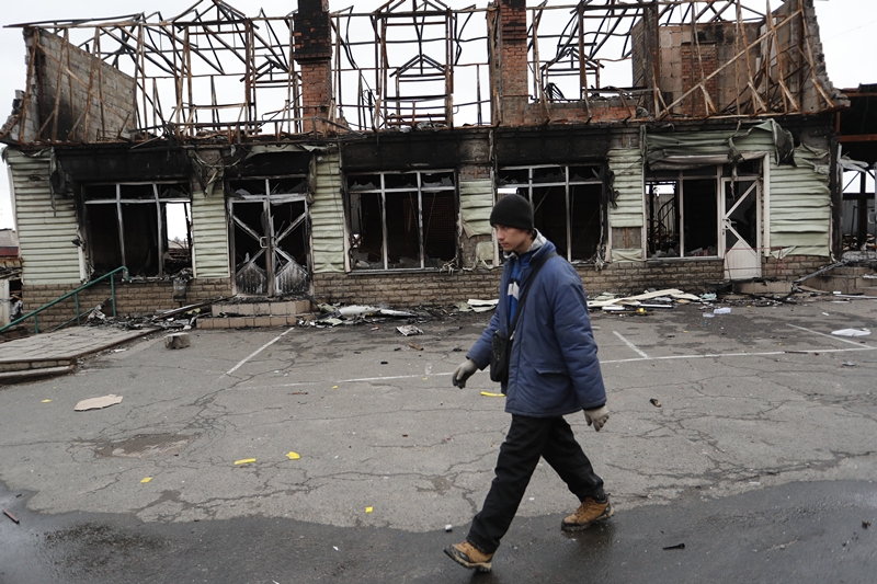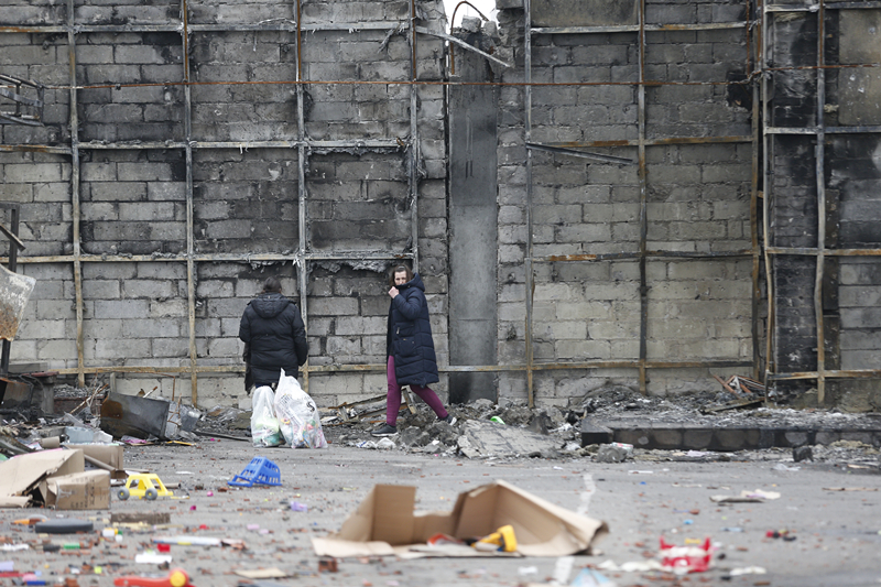 4月14日,马里乌波尔当地居民从被损坏的建筑旁走过。新华社发(维克托摄)