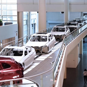 2月16日,在华晨宝马沈阳铁西工厂,生产中的车辆穿过办公区。新华社记者杨青摄