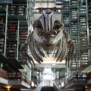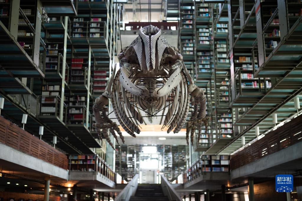 这是4月18日在墨西哥首都墨西哥城拍摄的巴斯孔塞洛斯图书馆内的灰鲸骨骼。