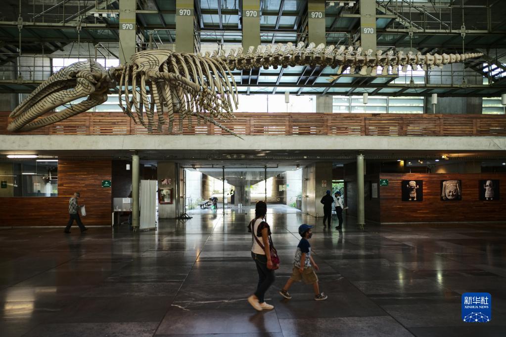 4月18日,在墨西哥首都墨西哥城的巴斯孔塞洛斯图书馆,人们走过馆内的灰鲸骨骼。