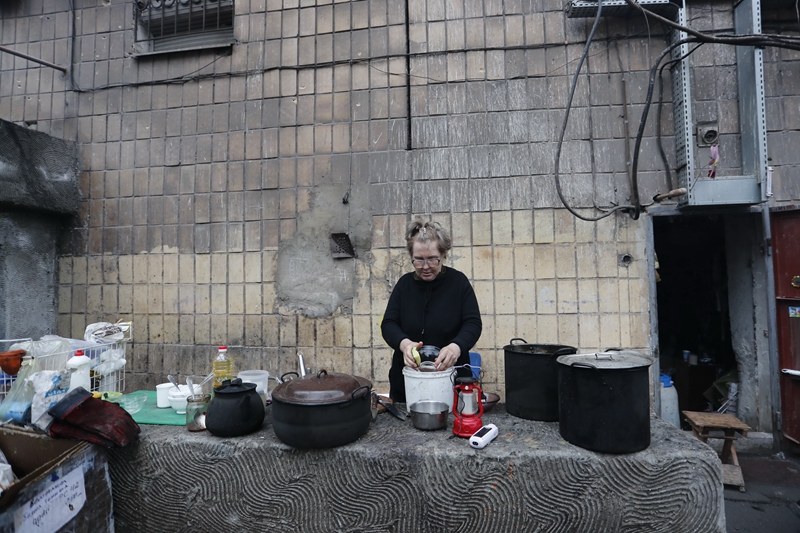 ↑4月14日,马里乌波尔当地居民在室外洗碗。新华社发(维克托 摄)