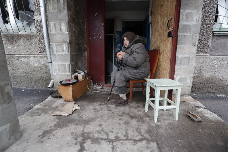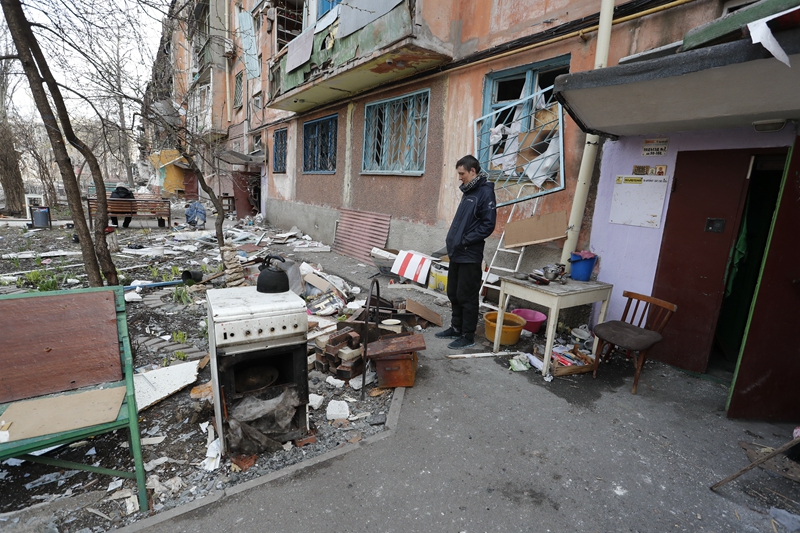 ↑4月14日,马里乌波尔当地居民坐在被损坏的建筑旁。新华社发(维克托 摄)