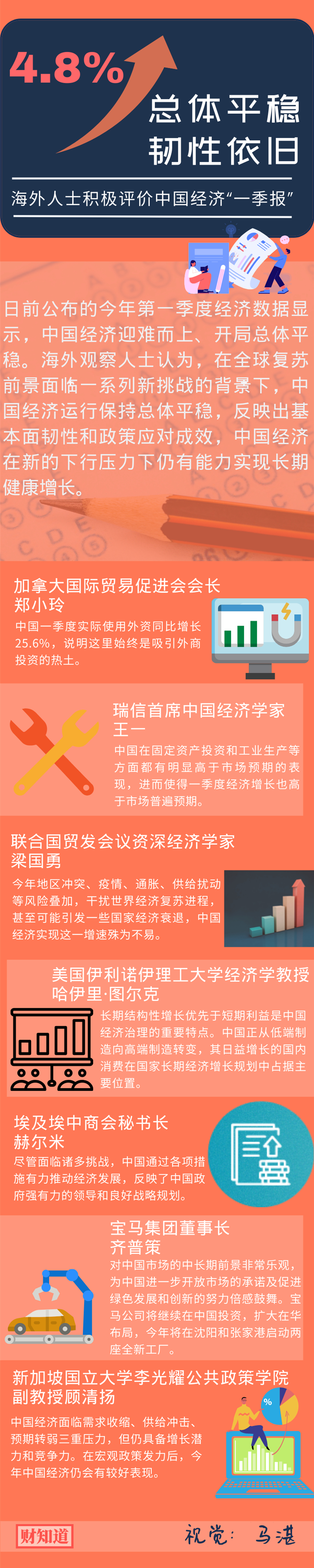 日前公布的今年第一季度经济数据显示,中国经济迎难而上、开局总体平稳。海外观察人士认为,在全球复苏前景面临一系列新挑战的背景下,中国经济运行保持总体平稳,反映出基本面韧性和政策应对成效,中国经济在新的下行压力下仍有能力实现长期健康增长。