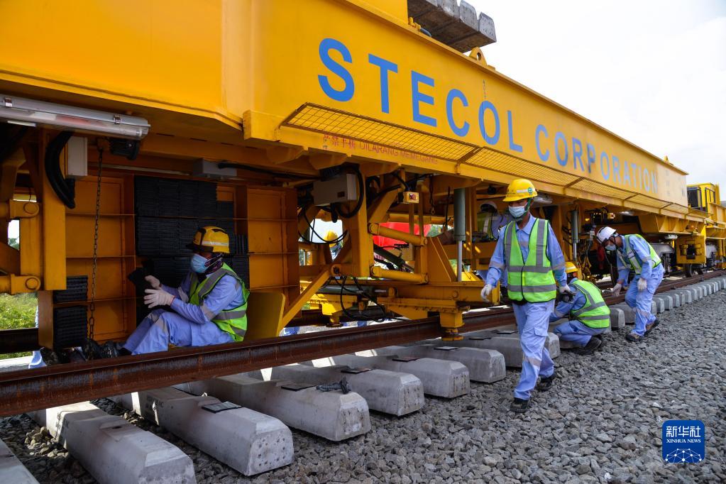 4月20日,工作人员在印度尼西亚万隆雅万高铁铺轨施工现场作业。新华社记者 徐钦 摄
