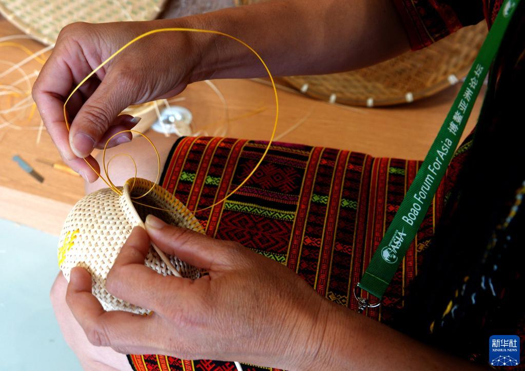 4月21日,黎族妇女在博鳌亚洲论坛主题公园展示藤编技艺。