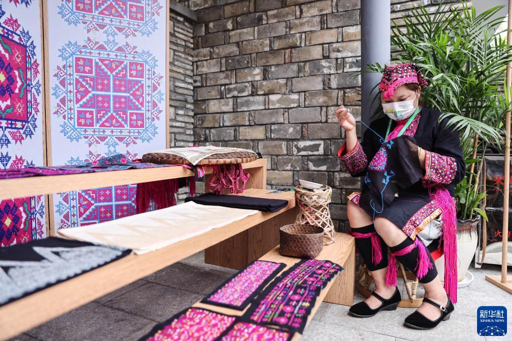 4月20日,苗族妇女在博鳌亚洲论坛主题公园展示苗绣技艺。