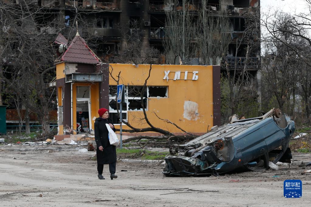 4月21日,在马里乌波尔,当地居民从被损坏的汽车旁经过。