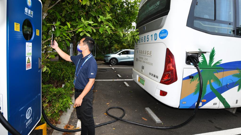 博鳌亚洲论坛国际会议中心附近,一位工作人员正在扫描充电桩上的二维码为客车充电。博鳌亚洲论坛联席会议工作机制领导小组办公室主任戴贞表示,本届年会征集的接待用车中新能源车约300辆,年会核心区酒店及周边已建成145个充电桩。海南首次搭建绿色电力交易系统,完成100万千瓦“绿电”交易,确保核心酒店场馆用电100%“绿电”保障。